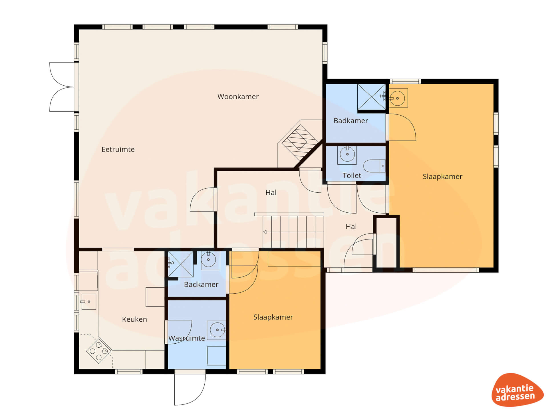 Het vakantiehuis heeft 7 ruime slaapkamers: beneden een 2-persoonskamer met eigen badkamer én een extra ruimte met stapelbed en extra douche/toilet – ideaal voor kinderen of als speelhoek. Op de bovenverdieping vind je nog 5 slaapkamers met verschillende indelingen (2-, 3- en 4-persoonskamers). De 3 badkamers (waarvan één met ligbad) en meerdere toiletten zorgen ervoor dat iedereen de dag ontspannen kan beginnen en afsluiten, zonder lange wachttijden.