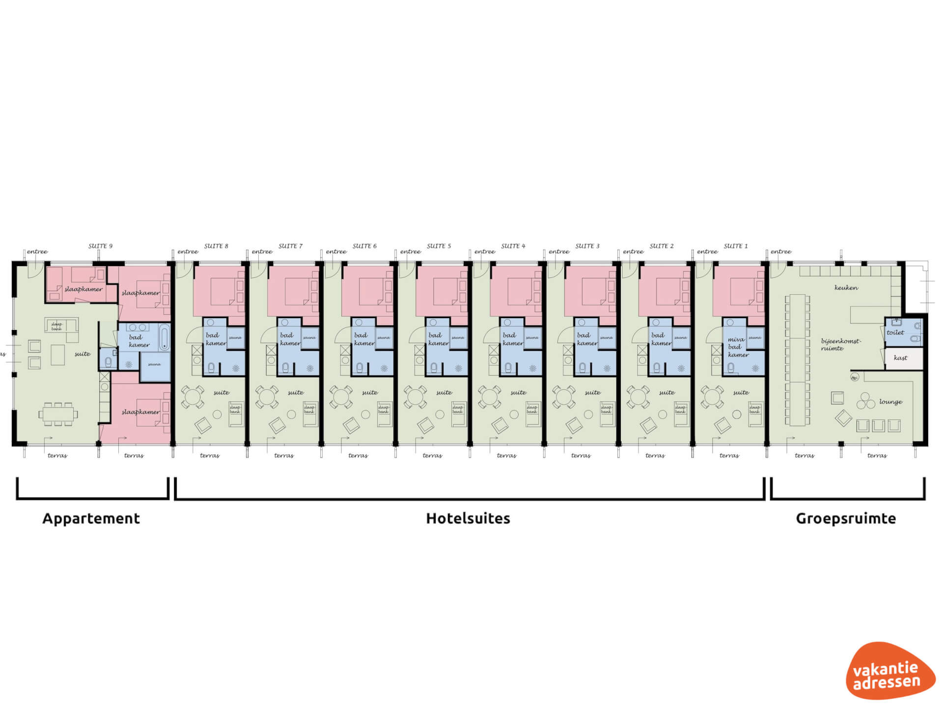 De acht 2 tot 4-persoons suites beschikken over een slaapkamer met twee 1-persoons boxspringbedden, een luxe badkamer met infraroodsauna, een kitchenette en een mooi ingerichte woonkamer. Het 6 tot 8-persoons appartement heeft 3 slaapkamers met twee 1-persoons boxsprings, een ruime lichte woonkamer, een keuken met vaatwasser en een luxe badkamer met finse sauna en ligbad. De bedden zijn opgemaakt en er liggen handdoeken klaar. In totaal beschik je over 11 slaapkamers en 9 badkamers.