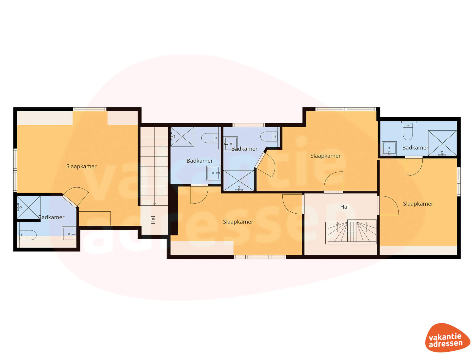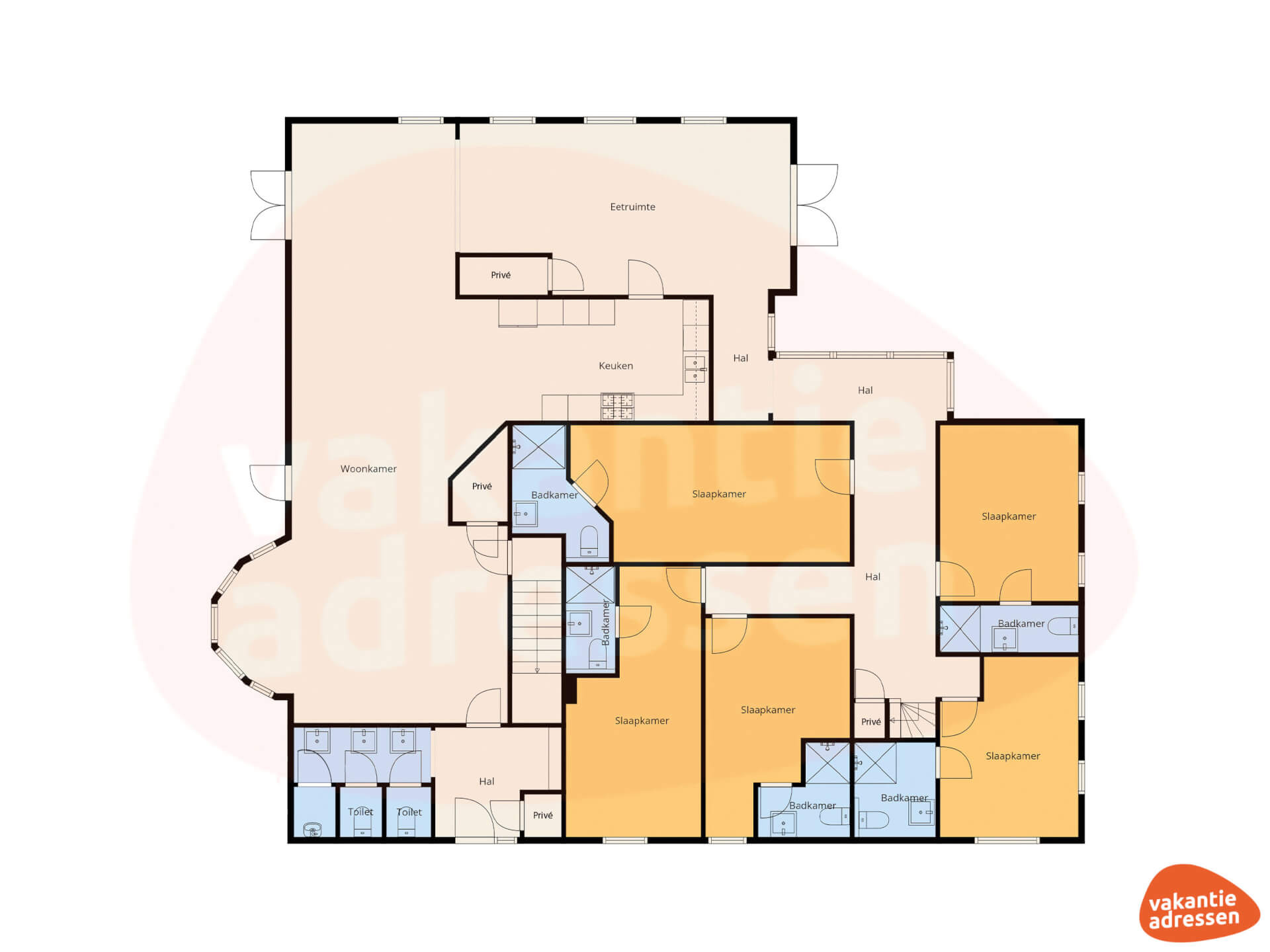 De accommodatie beschikt over 9 ruime slaapkamers, verdeeld over twee verdiepingen. Op de begane grond vind je 5 slaapkamers, 4 met twee 1-persoonsbedden, 1 met 3 bedden en elk een eigen badkamer met douche, toilet en wastafel. Op de bovenverdieping zijn nog 4 slaapkamers te vinden, waarvan 3 met drie 1-persoonsbedden, waarvan 1 direct boven de woonkamer is gelegen en toegankelijk is vanuit het leefgedeelte. Alle kamers boven zijn eveneens voorzien van een eigen badkamer met douche, toilet en wastafel. Dit maakt de accommodatie bijzonder geschikt voor allerlei gezelschappen, waarbij privacy en comfort gewaarborgd blijven.