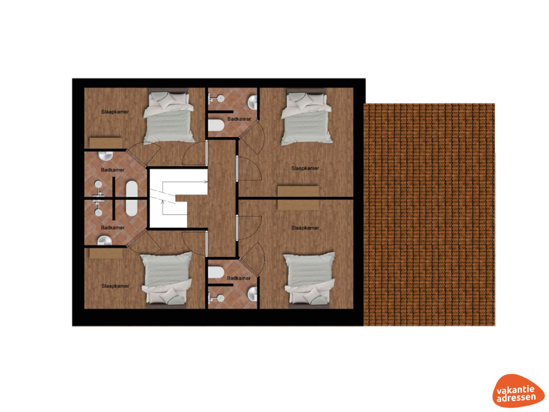 Na een dag vol gezelligheid en activiteiten is een goede nachtrust gegarandeerd in de 7 sfeervolle slaapkamers en 6 badkamers. Op de begane grond bevindt zich 1 ruime slaapkamer met twee 1-persoonsbedden en een badkamer met inloopdouche, toilet en wastafel. Op de eerste verdieping zijn 4 slaapkamers: 2 kamers voor 2 personen en 2 kamers voor 3 personen – ideaal voor gezinnen of kinderen die samen willen slapen. Alle kamers zijn uitgerust met comfortabele 1-persoons boxspringbedden. Elke kamer beschikt over een eigen badkamer met inloopdouche, toilet en wastafel, wat zorgt voor extra luxe en privacy. De tweede verdieping heeft 2 ruime slaapkamers onder de karakteristieke, houten balken van het dak, elk met drie 1-persoonsbedden. Ze delen een zeer ruime badkamer met vloerverwarming, inloopdouche, toilet en wastafel. Een knusse verdieping voor kinderen, perfect voor kinderen, tieners of vriendengroepen die samen willen overnachten en nog even willen napraten over de avonturen van de dag. Voor de kleintjes zijn er gratis voorzieningen beschikbaar, zoals een kinderbedje, kinderstoel, traphekje en stopcontactbeveiliging.