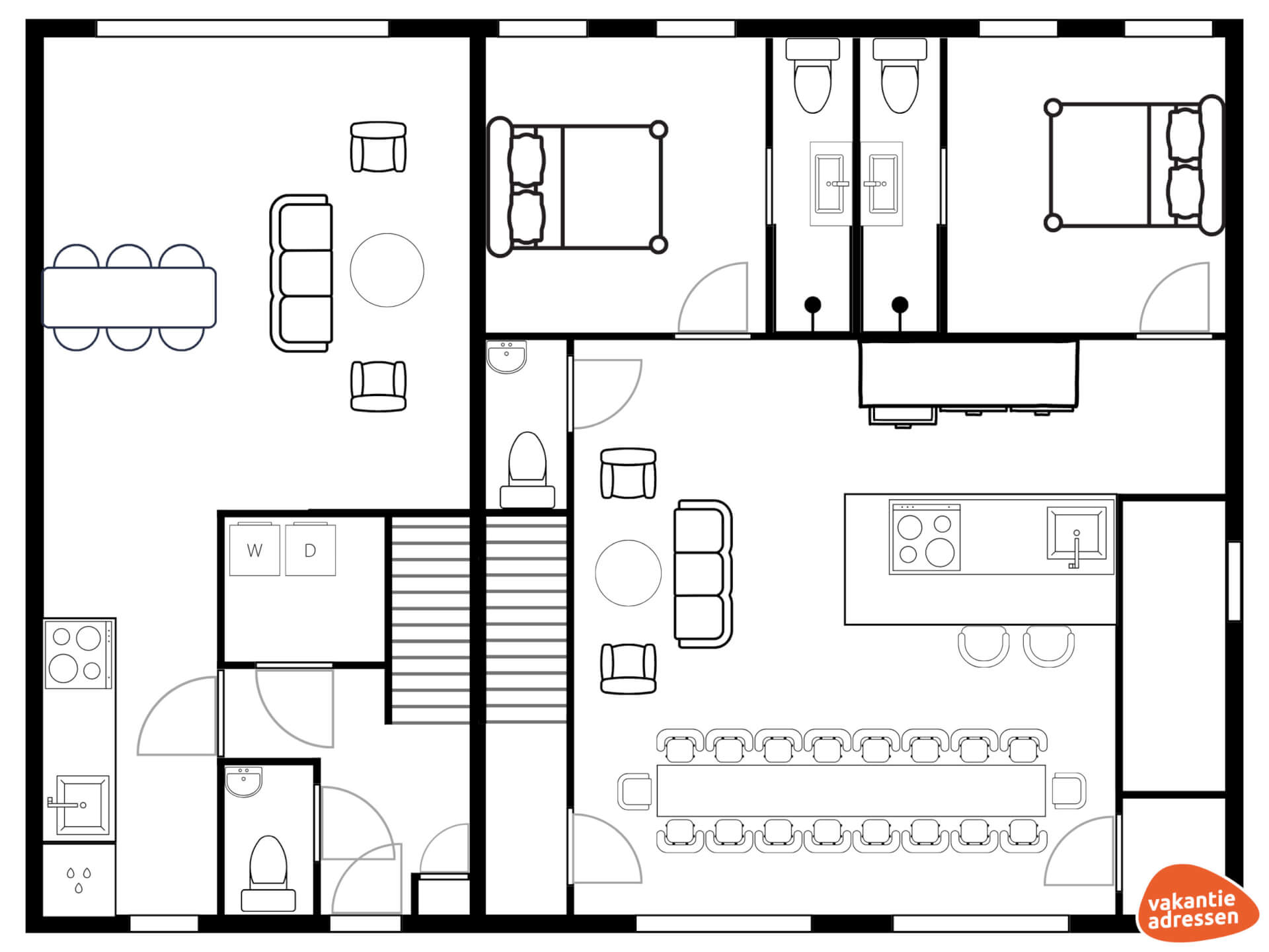 Huis 1 en 2 zijn niet geschakeld, via een aparte voordeur heb je toegang tot de woning. In de groepsruimte kan met het hele gezelschap samen gezeten worden.
