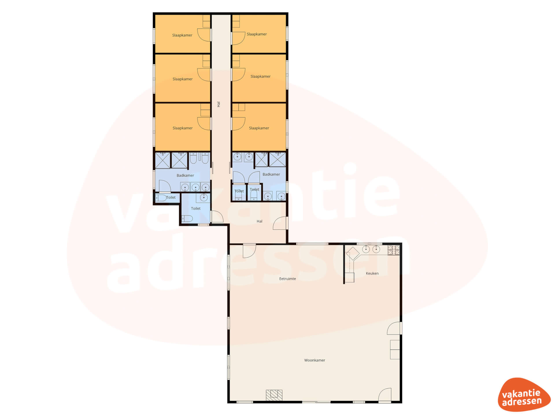 Alle 6 slaapkamers bevinden zich op de begane grond en bieden voldoende ruimte voor verschillende groepssamenstellingen. De badkamers met meerdere douches en toiletten zorgen ervoor dat iedereen zich gemakkelijk kan klaarmaken. Daarnaast is er een aangepaste badkamer aanwezig, waardoor ook gasten met een mobiliteitsbeperking hier prettig kunnen verblijven.
