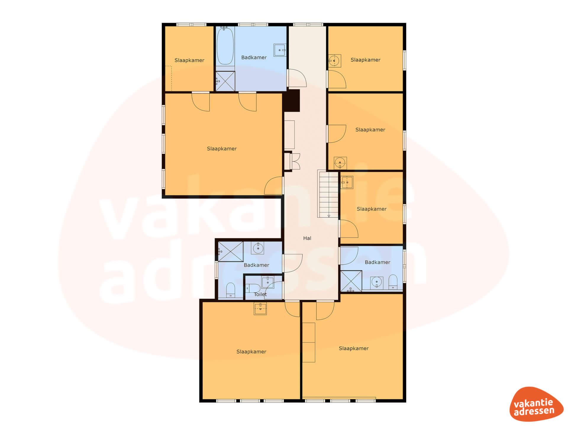 De 8 slaapkamers en 4 badkamers zijn verdeeld over twee verdiepingen. Beneden vind je een 2-persoonskamer en een badkamer. Op de eerste verdieping bevinden zich vijf 2-persoonskamers, twee 3-persoonskamers, twee badkamers en een separate douche en toilet. Alle slaapkamers zijn gezellig ingericht en voorzien van comfortabele bedden, de badkamers zijn erg ruim en voorzien van douche, toilet en wastafel. Bovendien heeft een van de badkamers op de eerste verdieping een ligbad, voor een momentje van totale ontspanning.