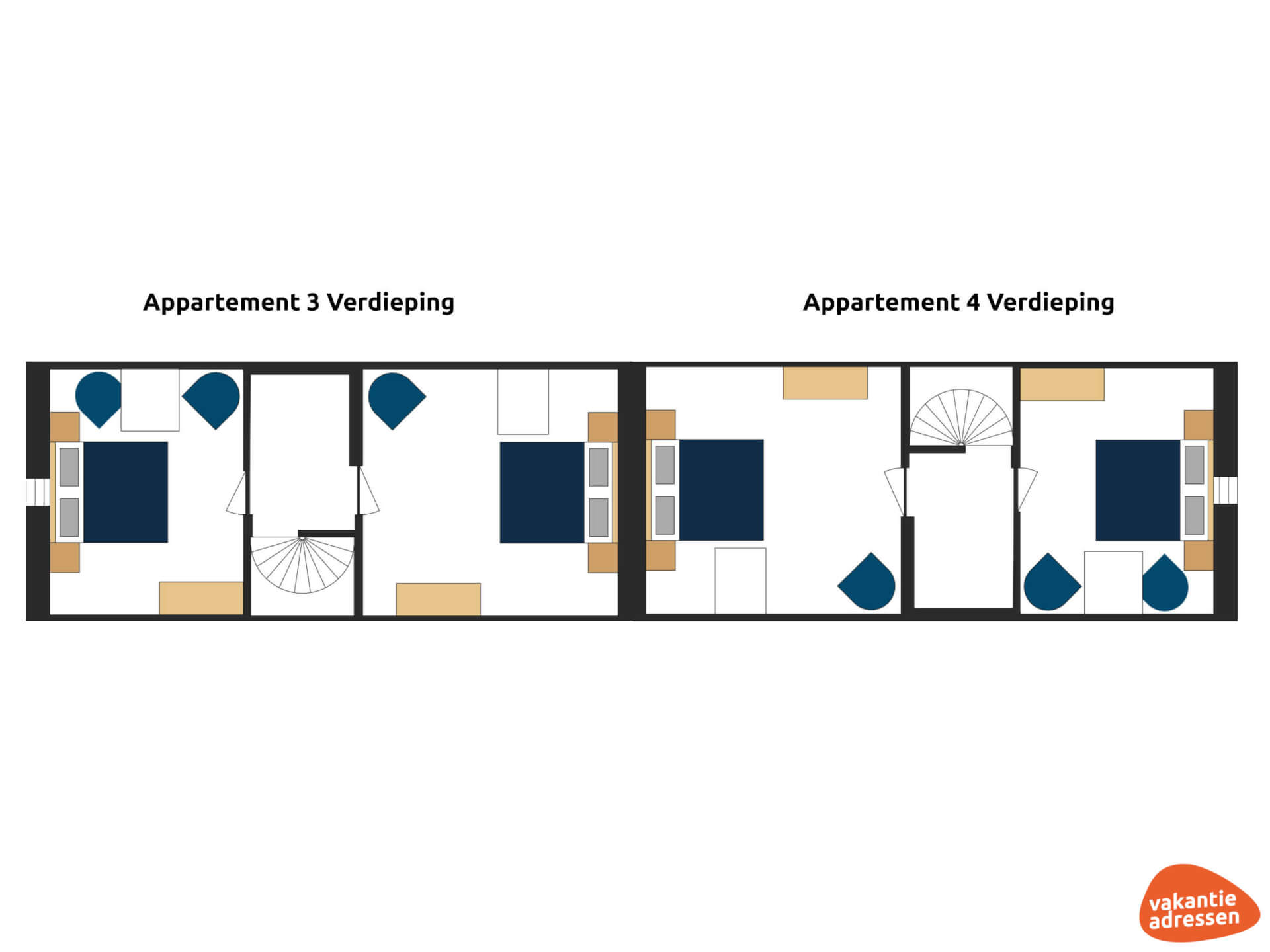 Eén appartement is geheel gelijkvloers en daardoor erg geschikt voor gasten die slecht ter been zijn. Dit appartement heeft 2 boerderijkamers, die beide nieuwe 2 persoons-boxspringbedden hebben, met warme kleuren zijn ingericht om van een optimale nachtrust te kunnen genieten. De luxe badkamer heeft een douche, toilet en wastafel. Twee andere appartementen zijn op dezelfde manier uitgerust, qua slaapkamers en badkamers, waarbij 1 appartement ook een badkuip heeft. Het grootste appartement heeft een extra slaapkamer en in de badkamer een badkuip, om even heerlijk te ontspannen en weg te dromen. Alle 4 appartementen zijn intern geschakeld met de grote algemene ruimte.